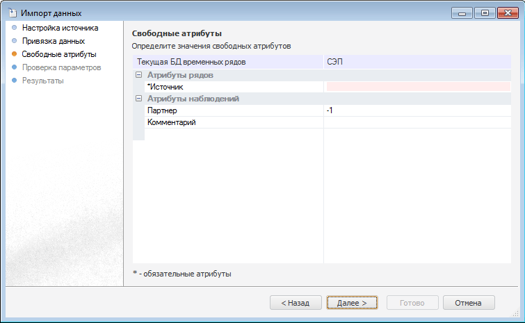 Атрибуты временных рядов и атрибуты наблюдений разделены по соответствующим группам. Обязательно должны быть указаны значения атрибутов, отмеченных звездочкой.