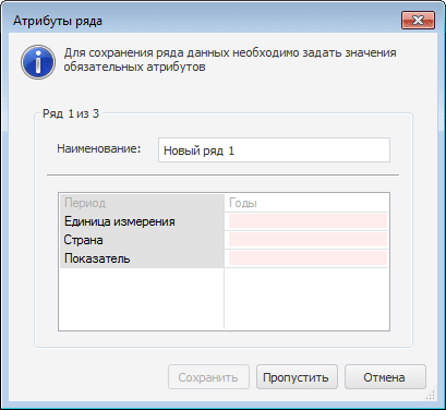 Если при сохранении нового временного ряда не заданы значения всех обязательных атрибутов, то будет отображен диалог «Атрибуты ряда»: