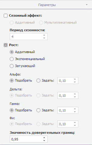 Рост. Временные ряды часто имеют тенденцию некоторого роста (убывания). Если флажок установлен, то в модель экспоненциального сглаживания использует коэффициент, учитывающий рост - «Гамма». Укажите модель роста: