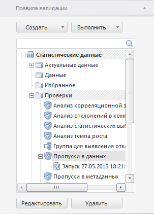 В инструменте анализа временных рядов валидация данных выполняется с помощью правил валидации. Для последовательного выполнения нескольких правил валидации они могут быть объединены в группу.