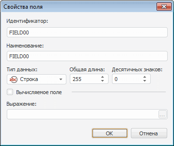 Для добавления нового поля нажмите кнопку «Добавить». Будет открыто диалоговое окно для указания значения атрибутов поля: