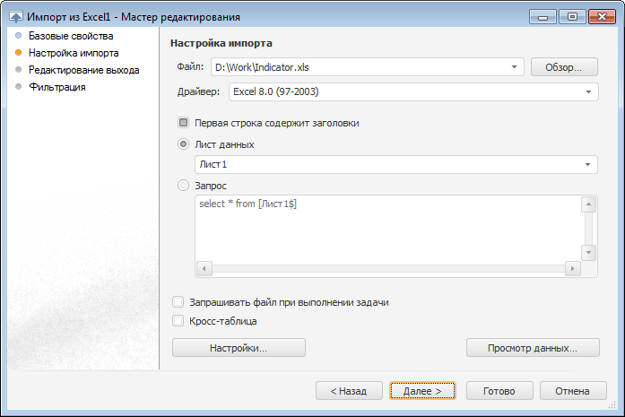 Если установить флажок «Запрашивать файл при выполнении задачи», то при выполнении задачи ETL будет открыт диалог для выбора файла Microsoft Excel. По умолчанию флажок снят, при этом работа осуществляется с тем файлом, который указан в поле «Файл».