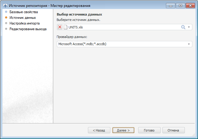 На странице «Источник данных» указывается файл с импортируемыми данными.