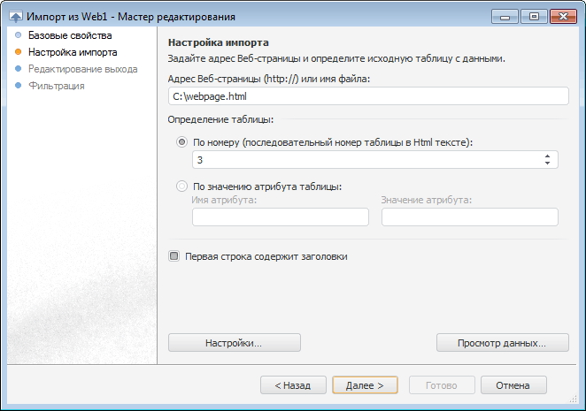 На странице «Настройка импорта» указывается файл или адрес веб-страницы с импортируемыми данными и параметры, которые используются для определения диапазона с данными.