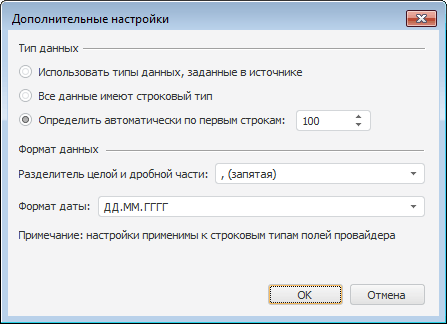Для определения типа данных импортируемых полей и других параметров используйте окно «Дополнительные параметры».