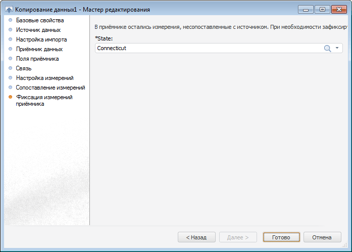 Зафиксируйте измерения, выбрав в раскрывающихся списках необходимые элементы. К выбранным элементам будет осуществлена привязка копируемых данных. После нажатия кнопки «Готово» объект «Копирование данных» будет сохранен.
