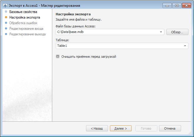 На странице «Настройка экспорта» приёмника данных «Access» указывается файл базы для экспорта данных.