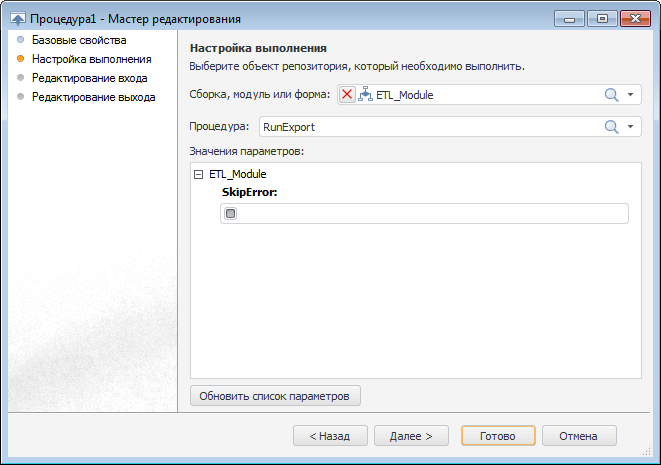 Список входов и выходов может формироваться только на основании выходов источника, к которому подключается текущий объект. При этом фактические данные в выполняемую процедуру/функцию передаваться не будут. Они один к одному будут переданы со входа на выход. Задание входов/выходов используется для включения объекта «Процедура» в какую-либо цепочку выполнения.