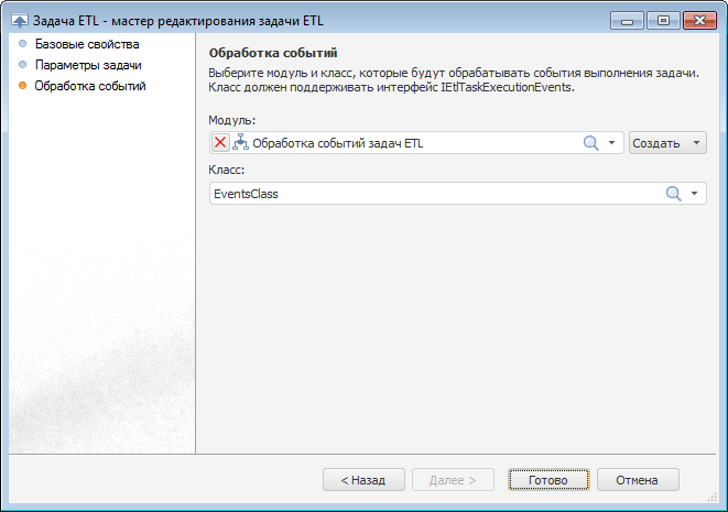 В раскрывающемся списке «Модуль» выберите объект среды разработки, а в списке «Класс» выберите класс, содержащий реализацию обработчиков событий задачи ETL. Список классов-обработчиков содержит все классы, унаследованные от класса EtlTaskExecutionEvents.