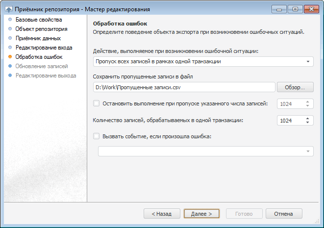 Примечание. Для объекта-приёмника Excel (*.xlsx) действие «Пропуск всех записей в рамках одной транзакции» отсутствует.