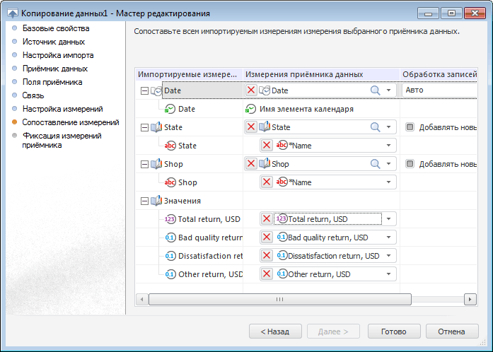 На странице «Сопоставление измерений» объекта «Копирование данных» осуществляется связь импортируемых измерений с измерениями приёмника данных.