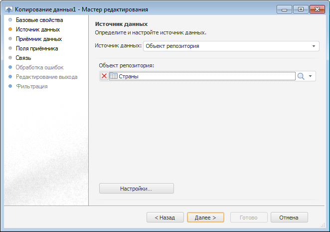 Настройки на странице «Источник данных» мастера редактирования объекта «Копирование данных» аналогичны настройкам на странице «Настройка импорта» выбранного в раскрывающемся списке источника данных:
