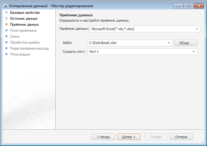 Настройки на странице «Приёмник данных» мастера редактирования объекта «Копирование данных» аналогичны настройкам на странице «Настройка экспорта» выбранного в раскрывающемся списке приёмника данных: