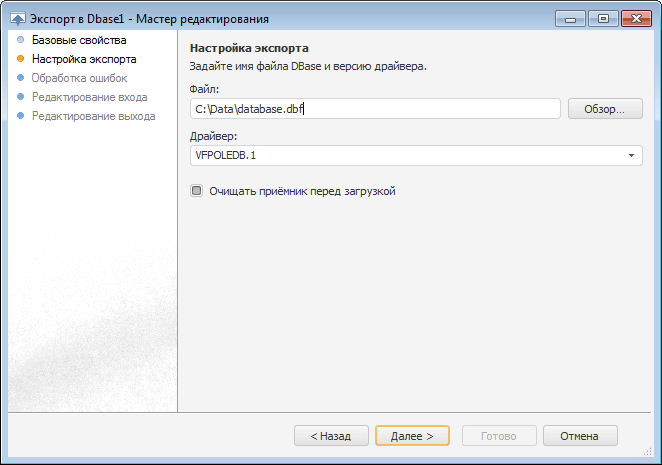 На странице «Настройка экспорта» приёмника данных «Dbase» указывается файл базы для экспорта данных.