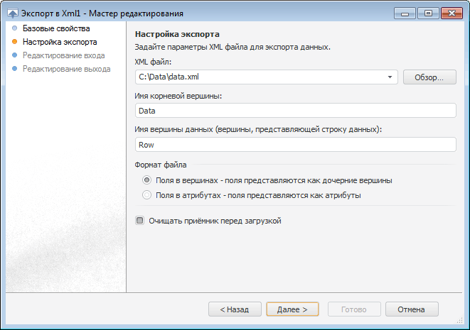 В поле «Имя корневой вершины» укажите наименование обязательного корневого элемента выходного XML-файла, а в поле «Имя вершины данных» - наименование элемента, который будет содержать данные.