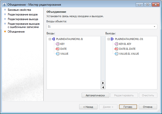 На странице «Объединение» устанавливается связь между полями входов и полями выхода.