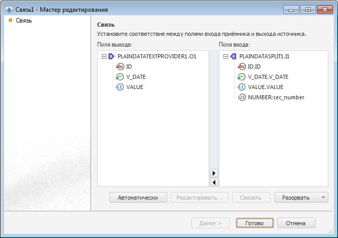 Ручное создание связей. Перетащите поле-выход на поле-вход, либо выделите данные поля и нажмите кнопку «Связать»;