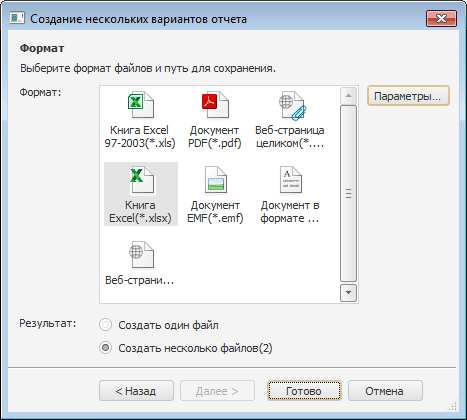 Выберите формат файла и результат экспорта. Если выбран формат Книга Excel (*.xls), доступно сохранение вариантов отчета в несколько файлов. При выборе других форматов, варианты отчета можно сохранить как в одном файле, так и в нескольких.