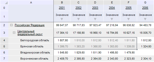 изменение исходных измерений и/или отметки может повлечь за собой сдвиг выделения областей в таблице данных и, соответственно, перестроению представлений.