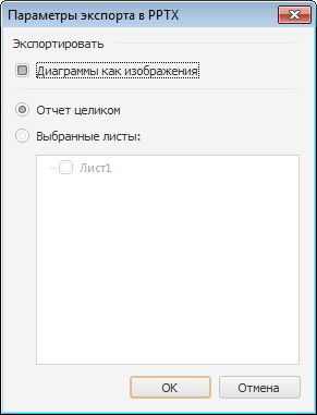 при экспорте в презентацию PPTX каждая печатная таблица будет экспортирована в отдельный слайд. Диаграмма и карта также экспортируются в отдельные слайды в виде изображений;