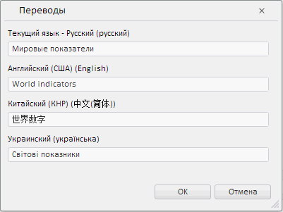 В открывшемся диалоговом окне «Переводы» введите наименования отчетов на разных языках:
