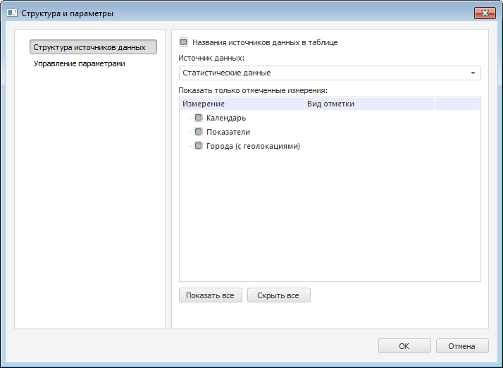 Для настройки структуры источника данных используйте вкладку «Структура источника данных» в диалоге «Структура и параметры».