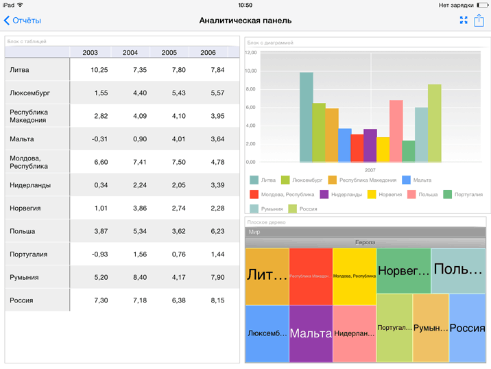 Аналитические панели в мобильном приложении также поддерживают работу со следующими блоками: