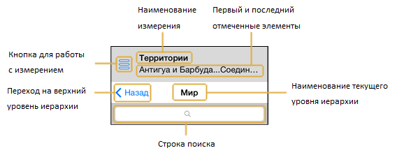 Панель измерений состоит из вкладок, каждая из которых представляет собой одно измерение. При нажатии на заголовок вкладки открывается список элементов.