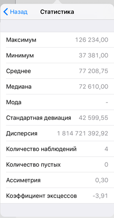 Для расчета статистики нажмите на заголовок строки или столбца и в открывшемся диалоге выберите пункт «Статистика». Будет открыто окно с рассчитанными статистическими характеристиками: