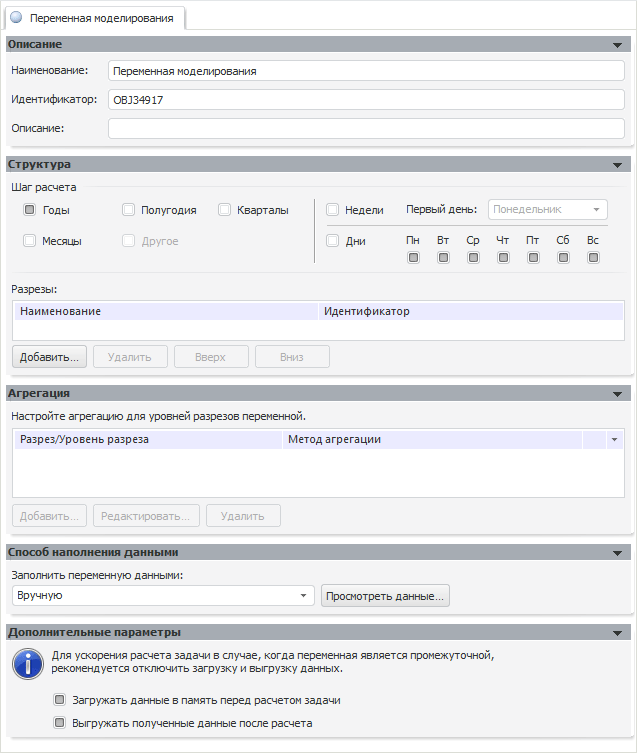 Примечание. Также могут быть использованы и другие методы агрегации. Например, для переменных, содержащих исходные данные по ценам («Мировая цена на газ» и «Мировая цена на нефть сорта Urals»), в качестве метода агрегации укажите «Фактическое среднее».