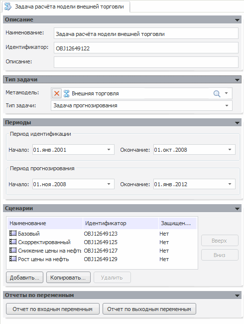 Задача будет рассчитана по сценариям «Факт» и «Базовый». После окончания расчета окончательные результаты будут выгружены в переменную «Сальдо торгового баланса, млрд.долл.США».