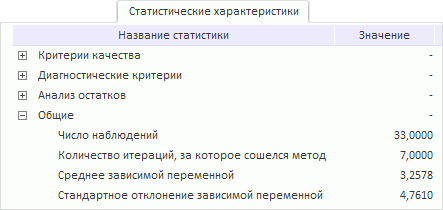 На вкладке «Статистические характеристики» отображаются значения различных статистических характеристик, рассчитанных для уравнения.