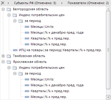 Структура дерева формируется на основании цепочки атрибутов, заданных в строке навигации. Уровни иерархии дерева отображаются в виде папок, названия которых соответствуют значениям атрибута. В дереве рядов доступна множественная отметка элементов при зажатой клавише SHIFT или CTRL.