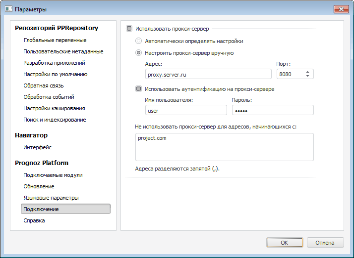 Примечание. В Prognoz Platform 8 в основе реализации подключения к прокси-серверу лежит сторонняя библиотека libcurl. С её назначением, возможностями и ограничениями можно ознакомиться на официальном сайте https://curl.haxx.se/libcurl/.