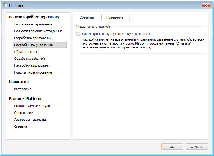 Для настройки поведения, которое будет использоваться в инструментах Prognoz Platform 8 используйте вкладку «Поведение»: