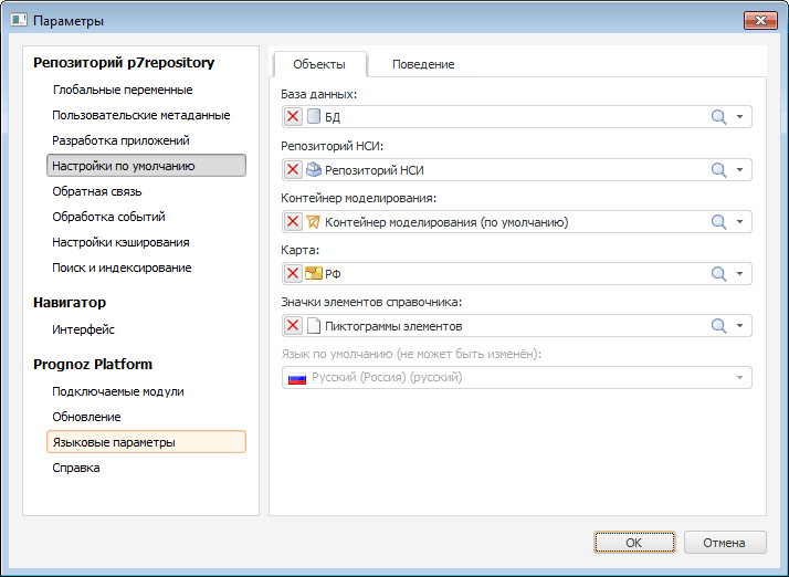 Настройки репозитория по умолчанию позволяют задать объекты или поведение объектов, которое будет использоваться в инструментах Prognoz Platform 8 без необходимости их повторного выбора. Например,карта, заданная по умолчанию, будет использоваться во всех отчетах.