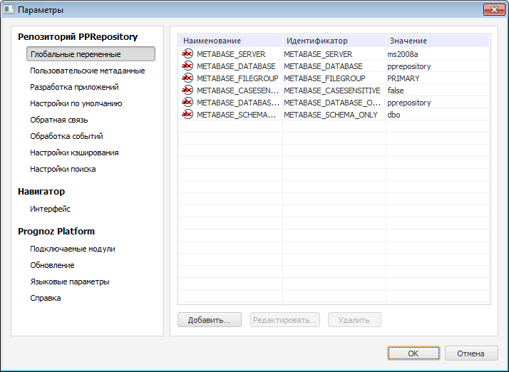 Глобальные переменные могут использоваться в различных инструментах Prognoz Platform 8: создание колонтитулов отчетов, задание значений параметров или составление выражений. Значения глобальных переменных можно задавать из навигатора объектов или с помощью языка Fore (подробнее смотрите в описании интерфейса ISharedParams). Значения глобальных переменных одинаковы для всех пользователей репозитория.