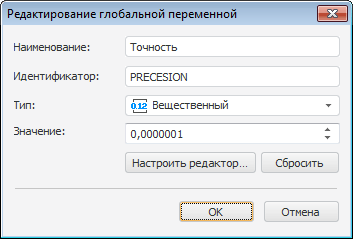 Значение. Для ввода значения переменной используется редактор, вид которого зависит от типа переменной. Для настройки редактора значений используется кнопка «Настроить редактор», при нажатии которой открывается диалог настройки редактора «Параметры редактора значений». При нажатии кнопки «Сбросить» пользовательская настройка редактора значений будет сброшена и он будет возвращен в состояние по умолчанию.