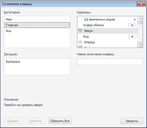 Текущие. В данном поле отображаются настроенные для выбранной команды сочетания клавиш. Для удаления текущего сочетания клавиш выделите его нажмите кнопку «Удалить». Для присвоения выделенной команде нового сочетания клавиш введите его в поле «Новое сочетание клавиш». Ввод осуществляется автоматически при нажатии нужных клавиш. Далее нажмите кнопку «Связать». Чтобы сбросить все текущие настройки сочетаний клавиш, нажмите кнопку «Сбросить все»;