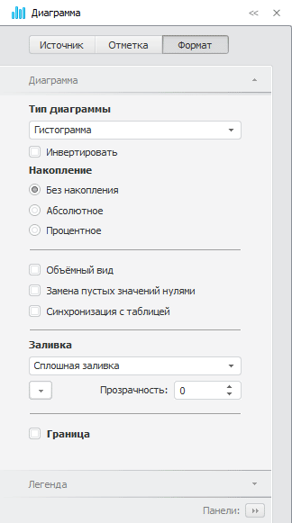 В верхней части панели отображаются наименование и пиктограмма активного объекта. На изображении выше активный объект - диаграмма.