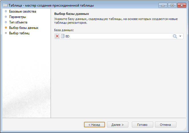 На странице «Выбор базы данных» укажите базу данных, содержащую таблицы, на основе которых требуется создать новые присоединенные таблицы репозитория.