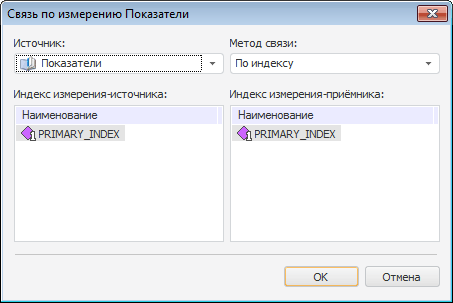 Связи измерений. В поле формируется связь измерений куба-источника с кубом-приёмником. Если в кубе -источнике и кубе-приёмнике имеются одинаковые измерения, то между ними автоматически устанавливается связь по индексу;