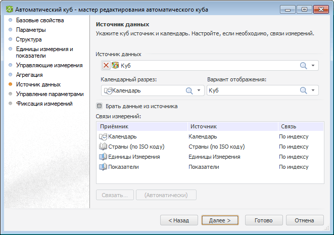 Страница «Источник данных» автокуба выглядит следующим образом: