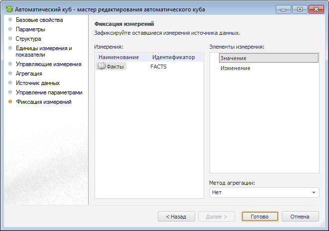 В поле «Элементы измерения» осуществляется отметка элементов. По умолчанию доступна единичная отметка элементов. Если в раскрывающемся списке «Метод агрегации» выбрать один из методов, то будет доступна множественная отметка элементов. Для выбранных элементов будет применяться агрегация фиксированных измерений с использованием указанного метода.