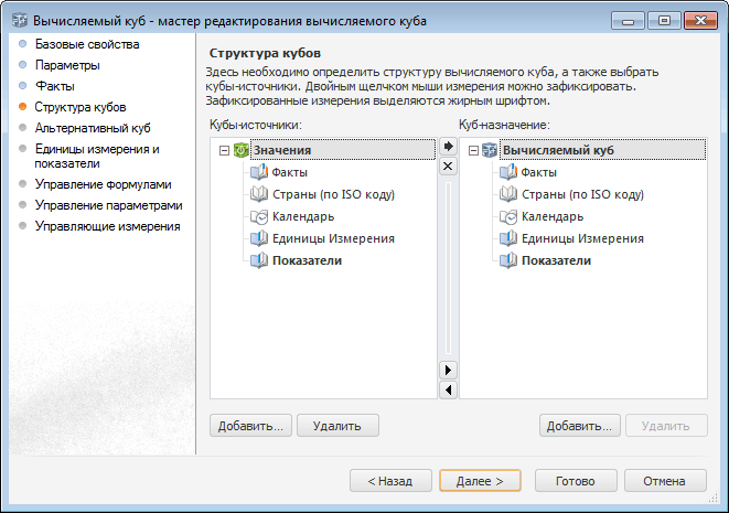 На странице «Структура кубов» определяется структура вычисляемого куба. Выбираются кубы-источники и определяются измерения вычисляемого куба.
