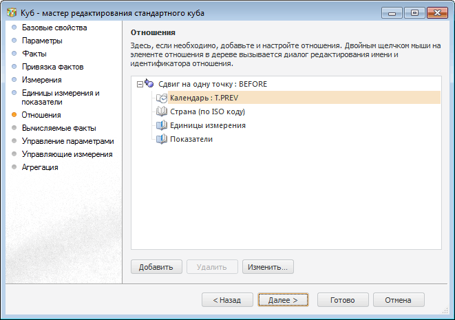 На странице мастера «Отношения» происходит добавление и настройка отношений, которые определяют взаимодействие между измерениями. Отношения используются при формировании формул для вычисляемых фактов и позволяют построить выражение с учетом отметки по другим измерениям.