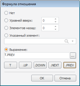 Уровней вверх. Результатом применения отношения будет элемент-владелец, отстоящий на указанное количество уровней от текущего элемента. Количество уровней задается в редакторе чисел, который становится доступным при установленном переключателе. Если, например, текущим является элемент «Пермская область» территориального справочника, то при указании перехода на один уровень вверх будет выбран элемент «Уральский район», а при указании перехода на два уровня вверх будет выбран элемент «Российская Федерация». Количество уровней вверх не может превышать общего количества уровней минус один.