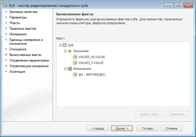 На странице «Вычисляемые факты» задаются формулы для вычисляемых фактов. Вычисляемый факт представляет собой функцию от значений других показателей: обычных и вычисляемых.