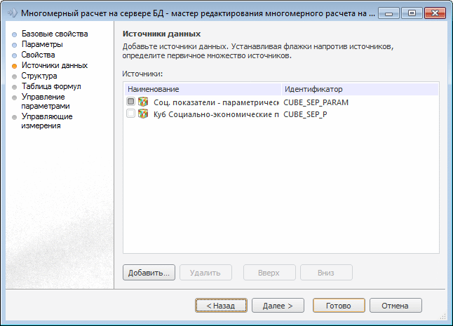 Для определения источников данных многомерного расчета на сервере БД и их первичного множества перейдите на страницу «Источники данных»: