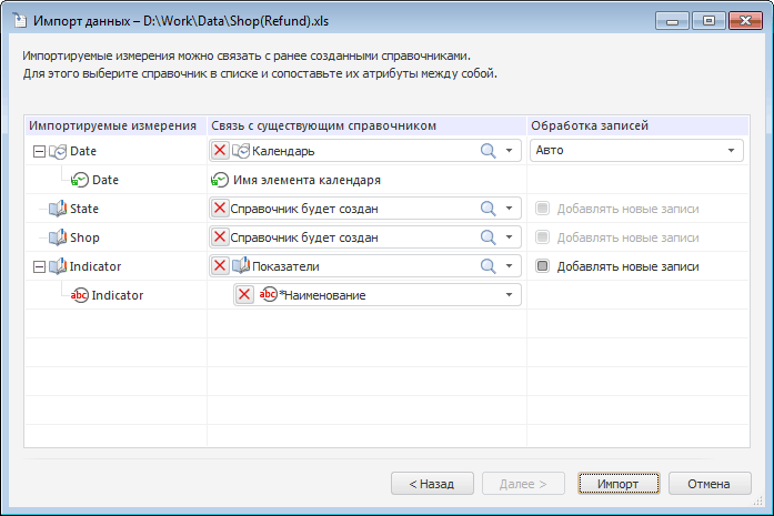 При нажатии на кнопку «Импорт» будет создан новый стандартный куб, созданы необходимые справочники, таблицы и импортированы данные.
